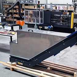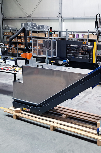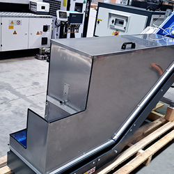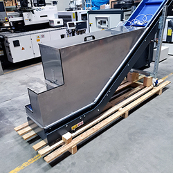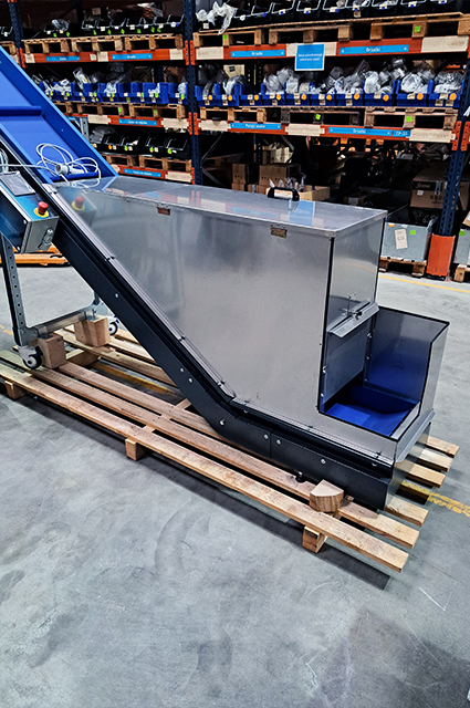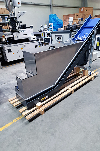 Conveyor with a special storage box for material that goes to the conveyor from shrder and then to the smaller SG for granulation.