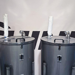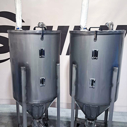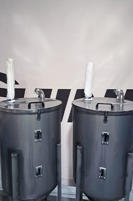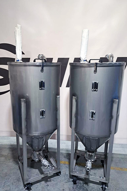 Stainless steel tank, diameter 60 cm, height 150cm , mounted on a frame and wheels. Designed to connect hoses transporting material to and from the tank using camlock connectors.